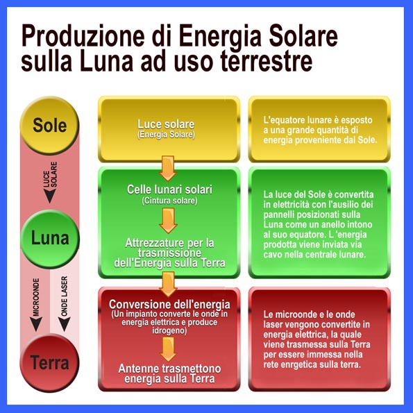 Grande pubblicità sul web ha trovato la proposta avanzata, già nel 2010, della società giapponese Shimizu Corporation, General Contractor, secondo la quale, con l’ausilio di tecnologie avanzate ancora in fase di sviluppo, sarebbe possibile convogliare sulla terra, via wireless, l’energia pulita del Sole raccolta in pannelli fotovoltaici installati sull’anello equatoriale della Luna.