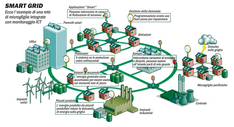 Nel disegno sopra, è raffigurato un esempio di Smart Grid complessa. Dalla gestione dell’energia in senso “smart”, derivano inoltre altre possibilità e ricadute positive sui territori interessati: