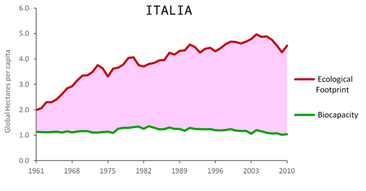 Siccome l’Impronta Ecologica procapite in Italia è circa 4,5 ettari, mentre la Biocapacità procapite è approssimativamente un ettaro, il calcolo precedente dà come risultato 81 giorni.