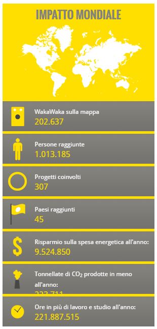Le famiglie off-grid- perché grazie a WakaWaka, ogni anno, vengono evitati pericolosi incidenti causati dalle lampade a cherosene (ustioni e malattie dell’apparato respiratorio); le ore in cui è possibile lavorare e studiare aumentano, favorendo istruzione e imprenditoria; le interazioni sociali vengono favorite ed ampliate, illuminando letteralmente le vite delle persone.