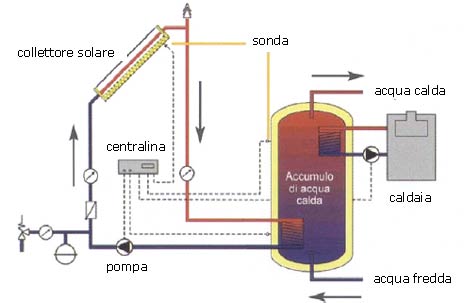 La pompa di circolazione viene messa in moto da una centralina elettronica che confronta le temperature dei collettori e dell’acqua nel serbatoio di accumulo rilevata da apposite sonde.